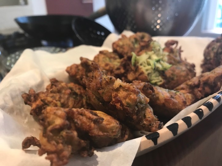 Je raspt 1 courget, 2 lenteuitjes in kleine ringetjes, 1 hand vol geraspte harde kaas, 1 teentje knoflook fijnsnijden, kluts er 1 ei doorheen en voeg zwarte peper uit de molen en een volle eetlepel gedroogde oregano toe. Nu voeg je zoveel zelfrijzend bakmeel toe tot er een dikke pap ontstaat. In de hete olijfolie schep je een goede eetlepel van het beslag en bakt dit goudbruin.