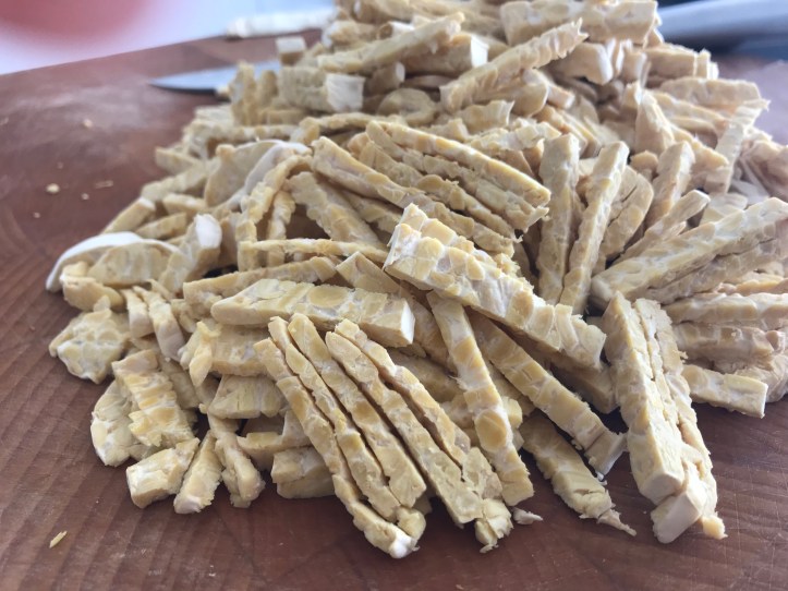 Snij de tempeh in plakken van een halve centimeter dik en versnijd die weer tot reepjes Ć” la luciferstokjes.