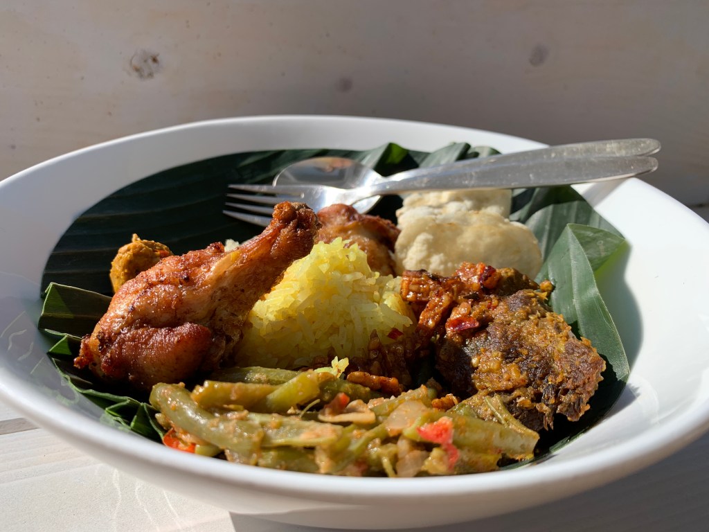 Nasi kuning eet je bijvoorkeur met “droge” bijgerechten. Omdat de rijst wordt gestoomd met geurige bladeren en kokoscreme is het redelijk machtig, een waterige sajoer of babi ketjap hoort hier dus niet echt bij. Van oorsprong werd nasi kuning geserveerd bij speciale gebeurtenissen: huwelijken, geboortes, verjaardagen én hilarisch genoeg op Sumatra zelfs op Salarisdag 😂.