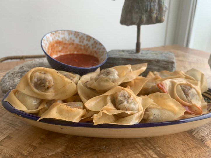 Long time no speak! Man o man wat is het lang geleden dat ik een receptje heb gedeeld. Dus ik kom maar meteen met een hele snelle, makkelijke, smakelijke borrelhap “Pangsit Goreng” met een home made chilisausje. Een traktatie die op menig Indisch feestje niet ontbreekt. Alhoewel de receptuur onwijs simpel is, is het best wel een beetje veel werk om de Pangsitjes te vouwen. Maar gelukkig mocht ik dit keer rekenen op de hulp van onze Remy met wie ik meteen weer eens lekker bij kon kletsen!